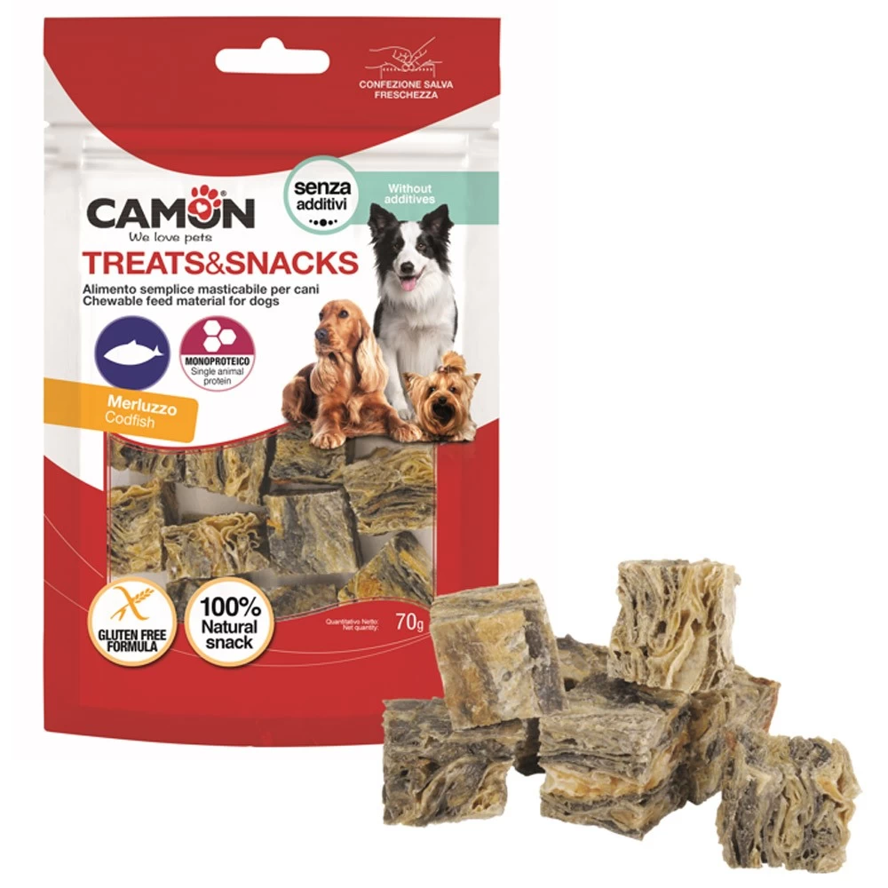 Deliziosi spuntini ricompensa per cani adulti di merluzzo, senza additivi, ricchi di omega 3-6 e senza glutine. Comodi da somministrare al tuo cane grazie alla confezione richiudibile salva freschezza.