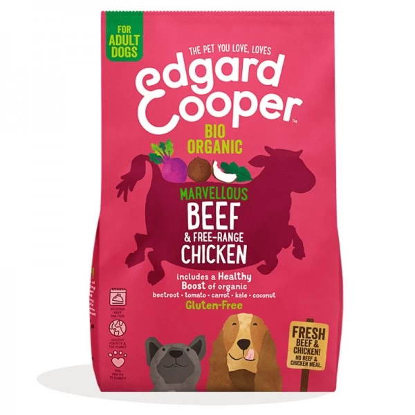 Pollo e manzo biologici allevati all’aperto con barbabietola, cavolo riccio e cocco