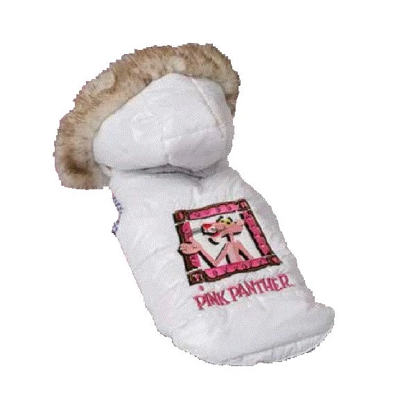 Piumino imbottito bianco con cappuccio staccabile. Ha delle cuciture a liste impreziosite dal ricamo pink panter applicato sulla schiena. L’interno è decorato con un delicato quadratino che richiama i tessuti vichy. Grazie al comodo cappuccio circondato dal pellicciotto, il vostro pet sarà protetto dal freddo.