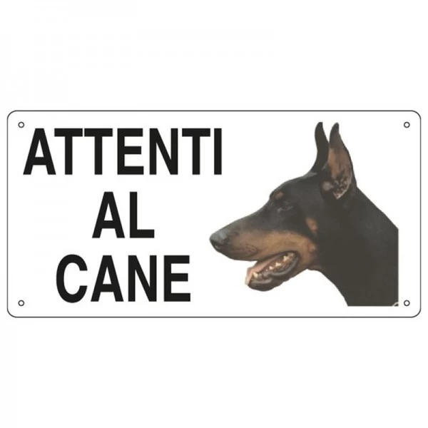 Cartello in metallo caratterizzato dalla scritta Attenti al cane e dall’immagine di un Dobermann